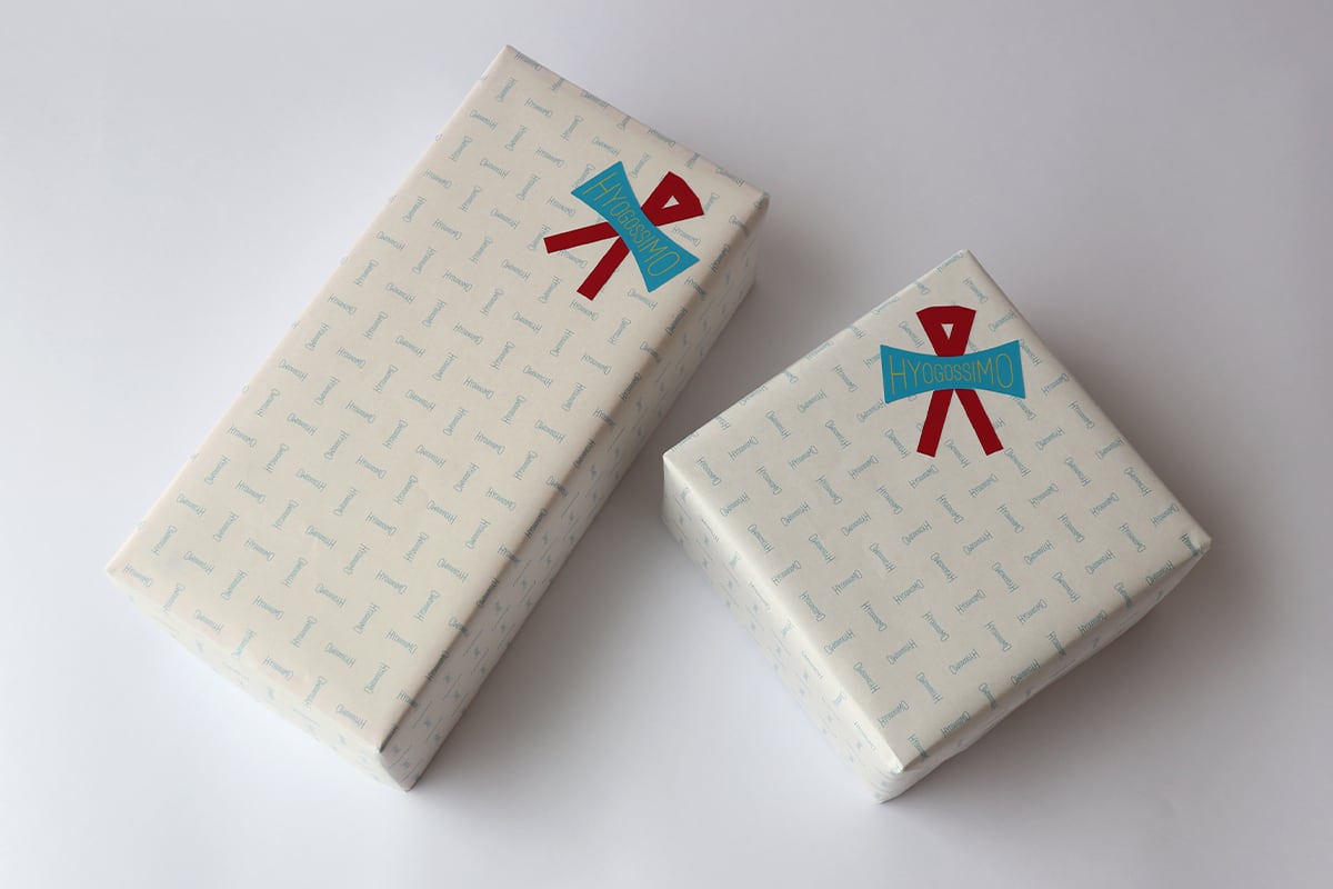 ラッピングご希望の商品をHYOGOSSIMOオリジナル包装紙で梱包し、HYOGOSSIMOのシールを包装紙表面にお貼りします。